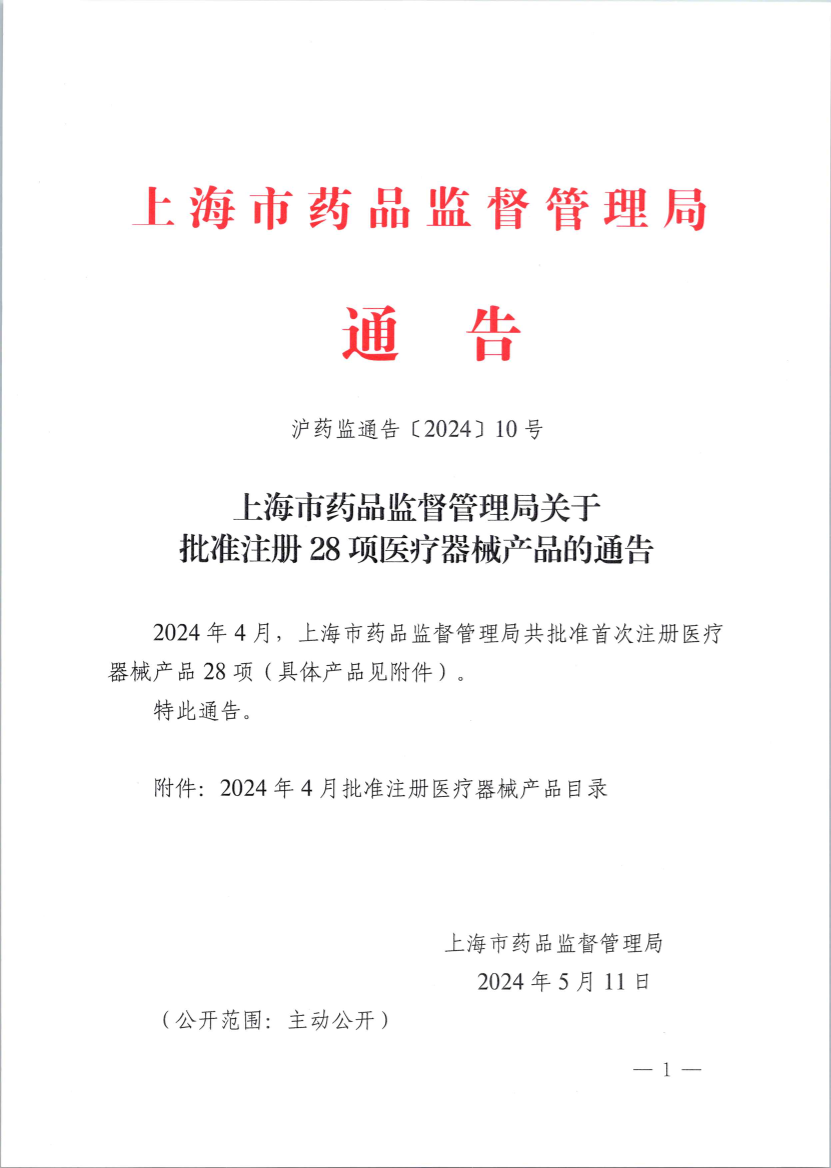 2024年4月,上海市药品监督管理局共批准首次注册医疗器械产品28项(具体产品见附件)。