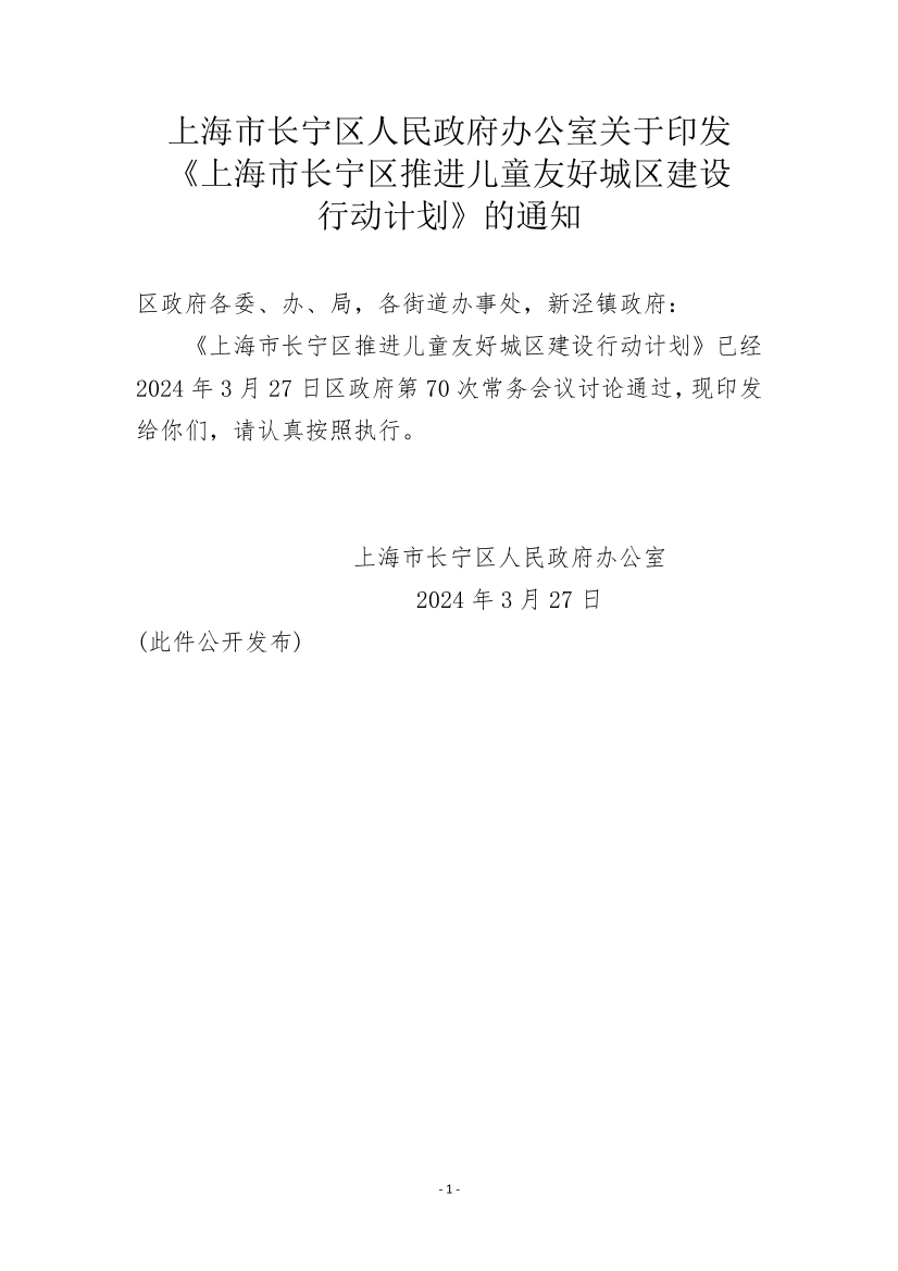 《上海市长宁区推进儿童友好城区建设行动计划》已经2024年3月27日区政府第70次常务会议讨论通过,现印发给你们,请认真按照执行。