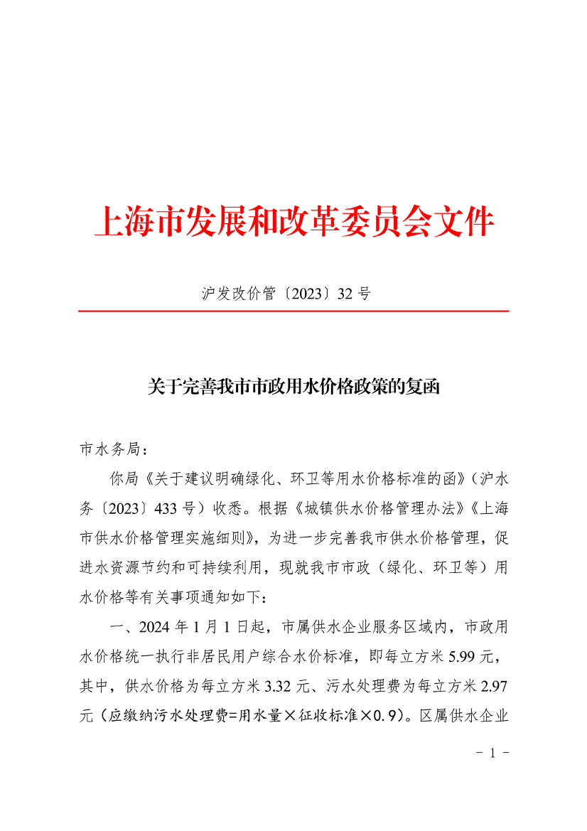 你局《关于建议明确绿化、环卫等用水价格标准的函》(沪水务〔2023〕433号)收悉。根据《城镇供水价格管理办法》《上海市供水价格管理实施细则》,为进一步完善我市供水价格管理,促进水资源节约和可持续利用,现就我市市政(绿化、环卫等)用水价格等有关事项通知如下: