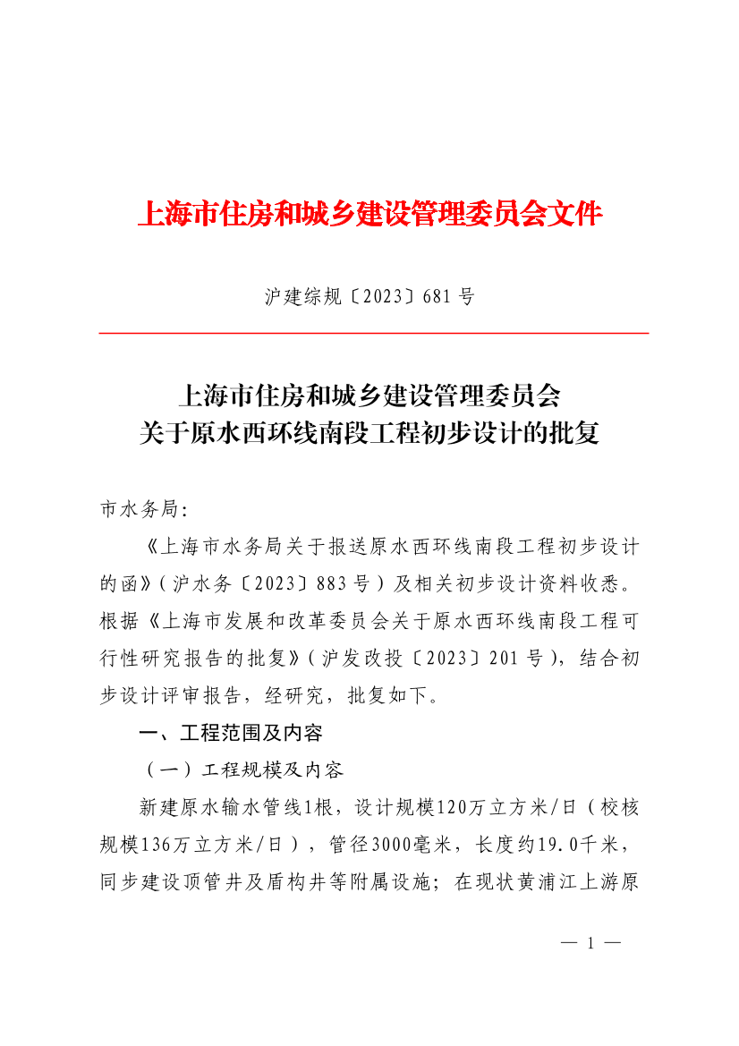 《上海市水务局关于报送原水西环线南段工程初步设计的函》(沪水务〔2023〕883号)及相关初步设计资料收悉。根据《上海市发展和改革委员会关于原水西环线南段工程可行性研究报告的批复》(沪发改投〔2023〕201号),结合初步设计评审报告,经研究,批复如下。