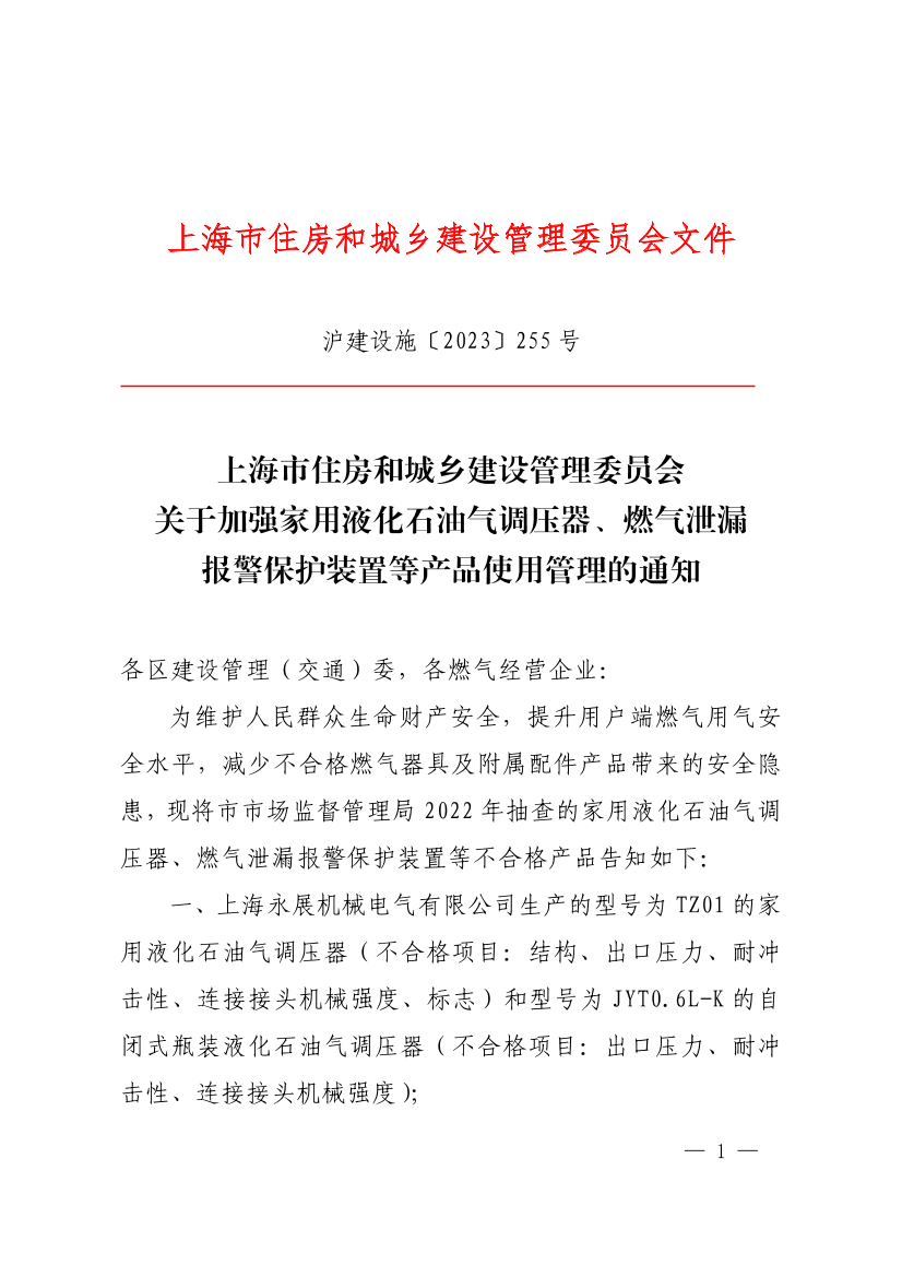 一、上海永展机械电气有限公司生产的型号为TZ01的家用液化石油气调压器(不合格项目:结构、出口压力、耐冲击性、连接接头机械强度、标志)和型号为JYT0.6L-K的自闭式瓶装液化石油气调压器(不合格项目:出口压力、耐冲击性、连接接头机械强度);