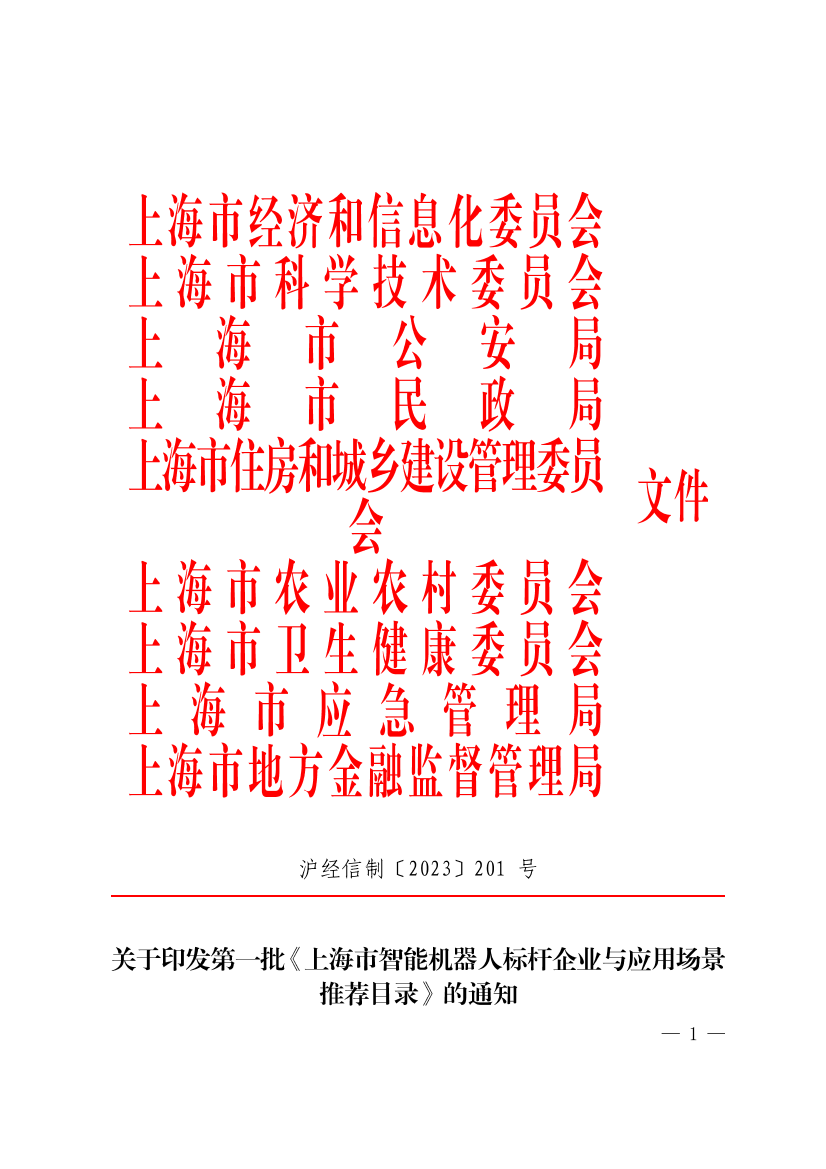 根据《上海市促进智能终端产业高质量发展行动方案(2022-2025年)》(沪府办发[2022]12号)、《上海市经济和信息化委员会 上海市科学技术委员会 上海市公安局 上海市民政局 上海市住房和城乡建设管理委员会 上海市农业农村委员会 上海市卫生健康委员会 上海市应急管理局 上海市地方金融监督管理局关于征集<上海市智能机器人标杆企业与应用场景推荐目录>的通知》(沪经信制[2022]716号)等文件精神,为打响一批家喻户晓的机器人品牌,促进产业成果赋能工业、医疗、建筑、农业、商业、家用、应急等领域智能应用升级,经组织广泛征集、各区推荐、答辩评审、网站公示等环节,形成第一批《上海市智能机器人标杆企业与应用场景推荐目录》入围名单(详见附件),现予以印发。