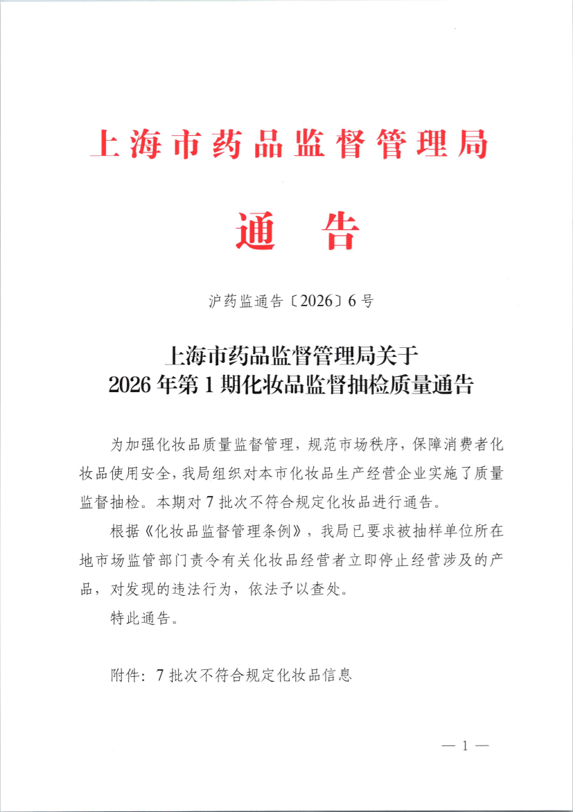 为加强化妆品质量监督管理,规范市场秩序,保障消费者化妆品使用安全,我局组织对本市化妆品生产经营企业实施了质量监督抽检。本期对7批次不符合规定化妆品进行通告。