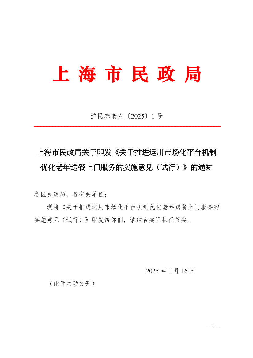 为进一步贯彻落实民政部等11部门联合印发的《积极发展老年助餐服务行动方案》(民发〔2023〕58号)和《关于推进本市老年助餐服务高质量发展的实施意见》(沪民规〔2024〕4号)等文件精神,推进运用市场化平台机制优化老年送餐上门服务,特制定本实施意见。