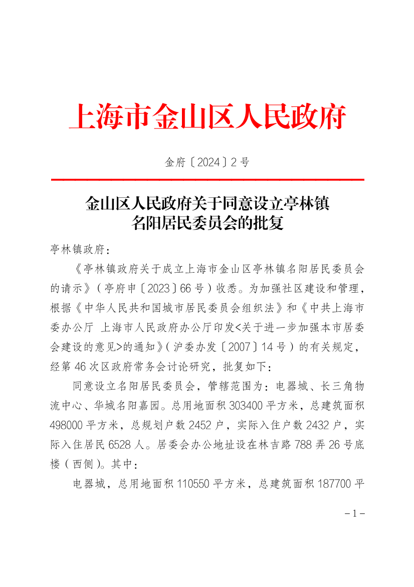 同意设立名阳居民委员会,管辖范围为:电器城、长三角物流中心、华城名阳嘉园。总用地面积303400平方米,总建筑面积498000平方米,总规划户数2452户,实际入住户数2432户,实际入住居民6528人。居委会办公地址设在林吉路788弄26号底楼(西侧)。其中: