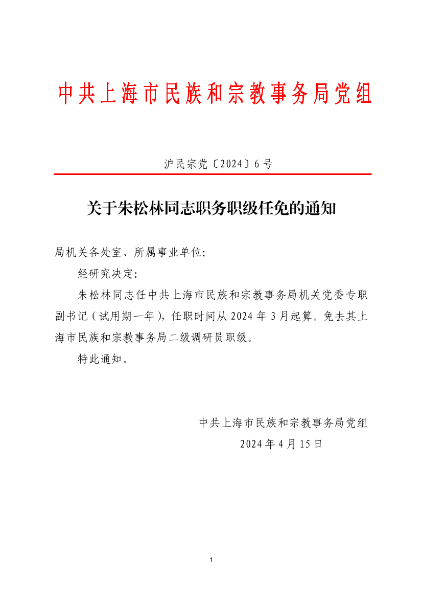 朱松林同志任中共上海市民族和宗教事务局机关党委专职副书记(试用期一年),任职时间从2024年3月起算。免去其上海市民族和宗教事务局二级调研员职级。