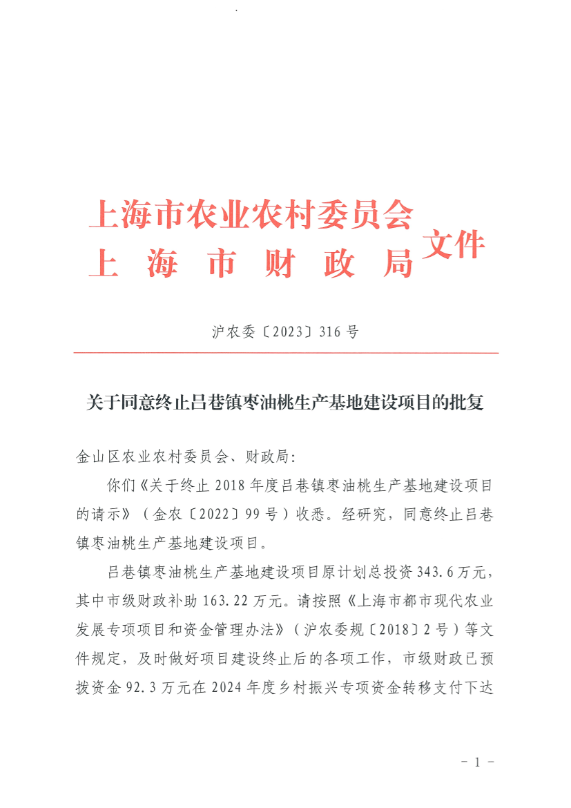 你们《关于终止2018年度吕巷镇枣油桃生产基地建设项目的请示》(金农〔2022〕99号)收悉。经研究,同意终止吕巷镇枣油桃生产基地建设项目。