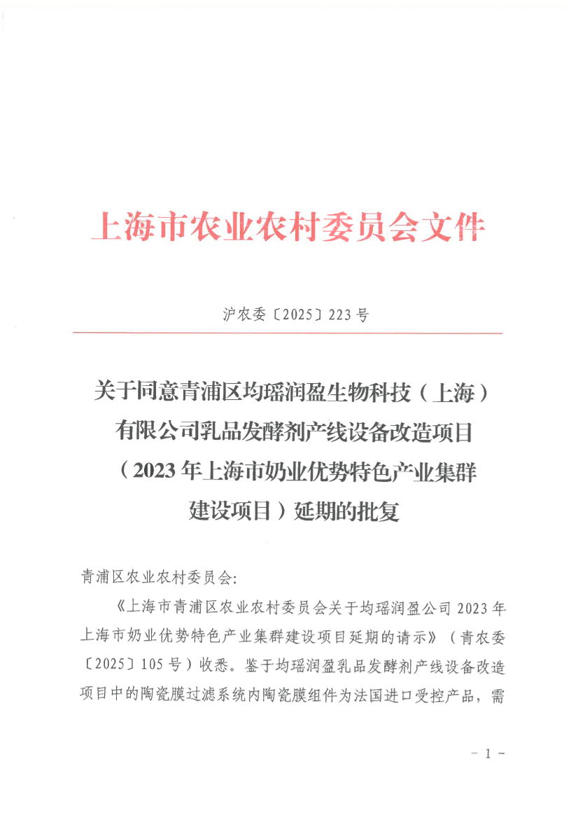 《上海市青浦区农业农村委员会关于均瑶润盈公司2023年上海市奶业优势特色产业集群建设项目延期的请示》(青农委〔2025〕105号)收悉。鉴于均瑶润盈乳品发酵剂产线设备改造项目中的陶瓷膜过滤系统内陶瓷膜组件为法国进口受控产品,需经法国商务部审查,获得相关许可证后采购回国进行产品组装,根据《关于做好上海市奶业优势特色产业集群项目和资金管理工作的通知》(沪农委〔2023〕198号),同意该项目延期,延期后的项目应于2026年6月底前完成区级验收。