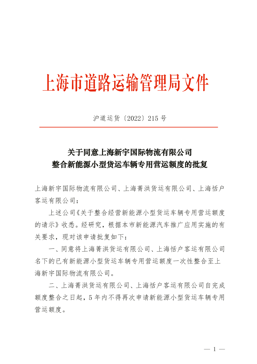 一、同意将上海菁洪货运有限公司、上海恬户客运有限公司名下的已有新能源小型货运车辆专用营运额度一次性整合至上海新宇国际物流有限公司。