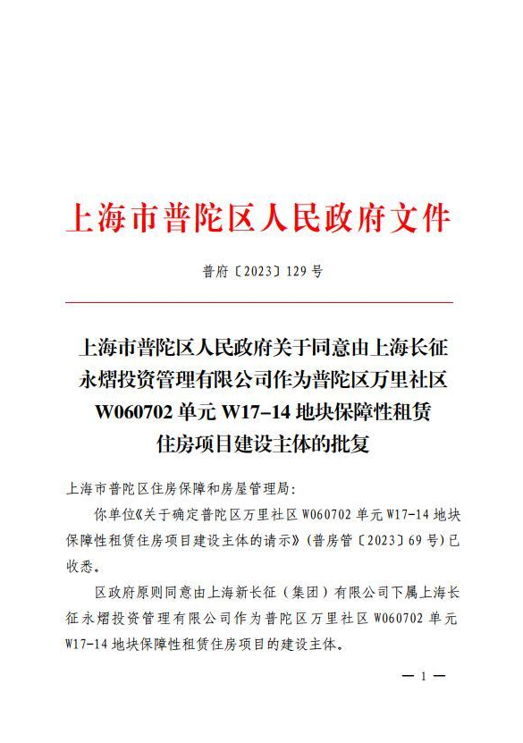 区政府原则同意由上海新长征(集团)有限公司下属上海长征永熠投资管理有限公司作为普陀区万里社区W060702单元W17-14地块保障性租赁住房项目的建设主体。