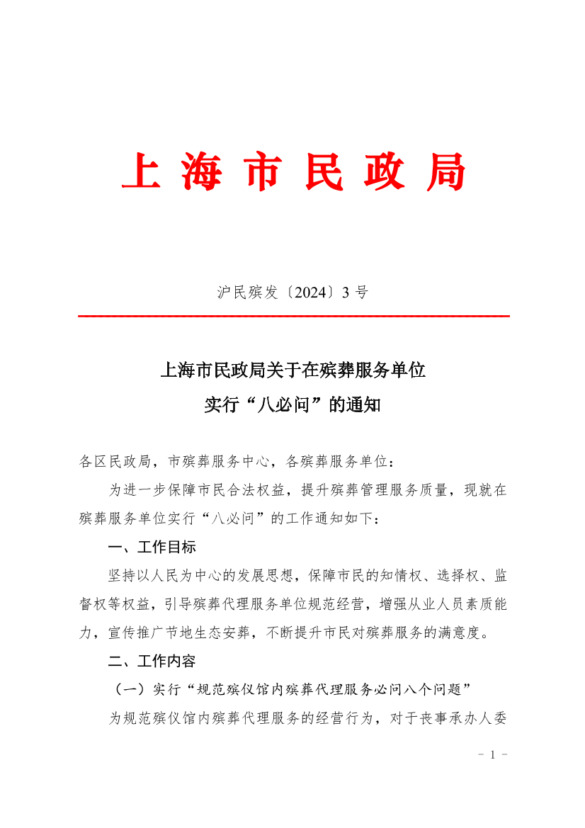 为进一步保障市民合法权益,提升殡葬管理服务质量,现就在殡葬服务单位实行“八必问”的工作通知如下: