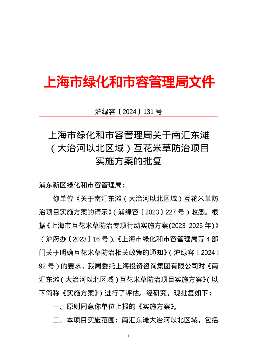 你单位《关于南汇东滩(大治河以北区域)互花米草防治项目实施方案的请示》(浦绿容〔2023〕227号)收悉。根据《上海市互花米草防治专项行动实施方案(2023-2025年)》(沪府办〔2023〕16号)、《上海市绿化和市容管理局等 4部门关于明确互花米草防治相关政策的通知》(沪绿容〔2024〕92号)的要求,我局委托上海投资咨询集团有限公司对《南汇东滩(大治河以北区域)互花米草防治项目实施方案》(以下简称《实施方案》)进行了评估。经研究,现批复如下: