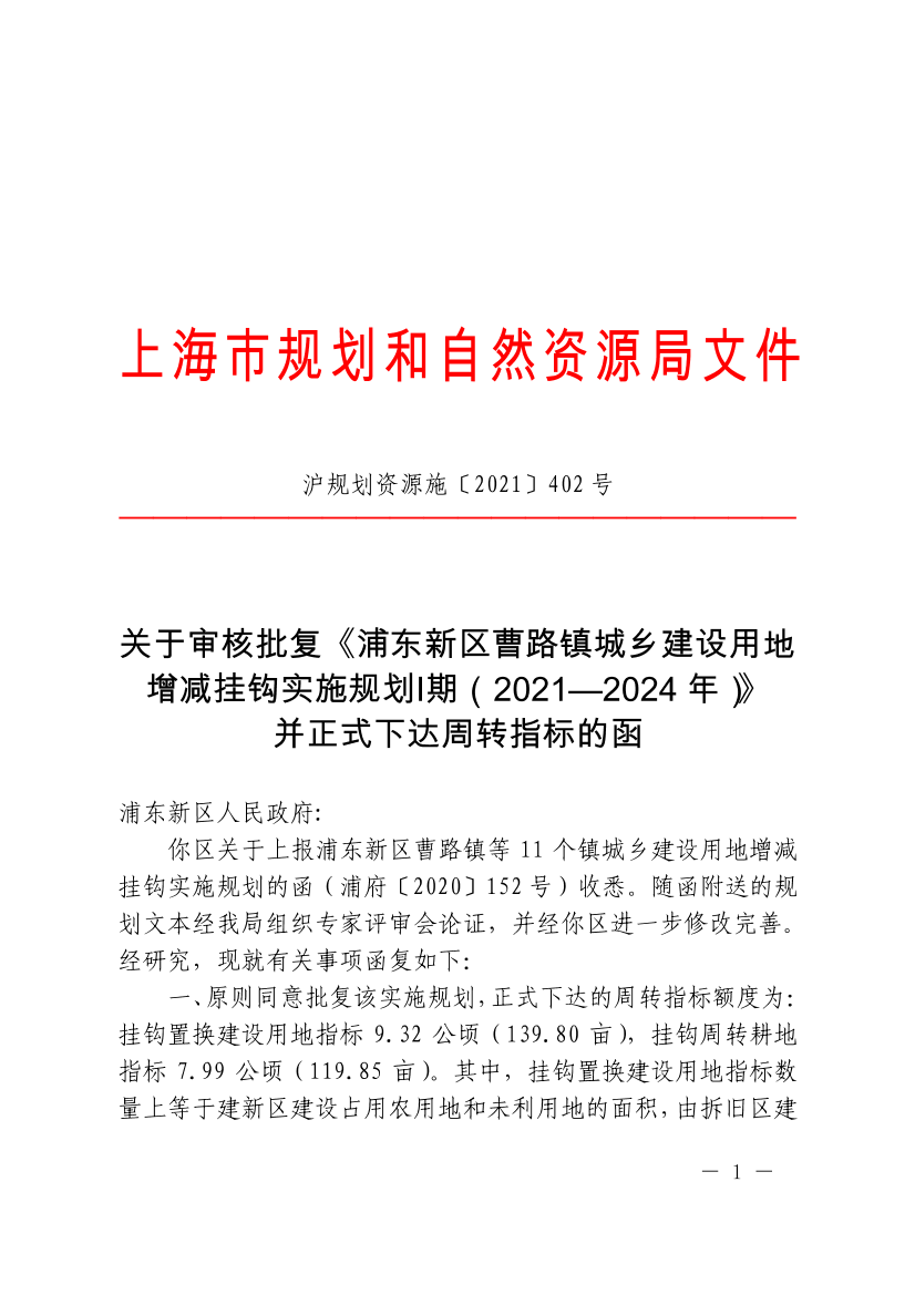关于审核批复《浦东新区曹路镇城乡建设用地增减挂钩实施规划Ⅰ期(2021—2024年)》并正式下达周转指标的函