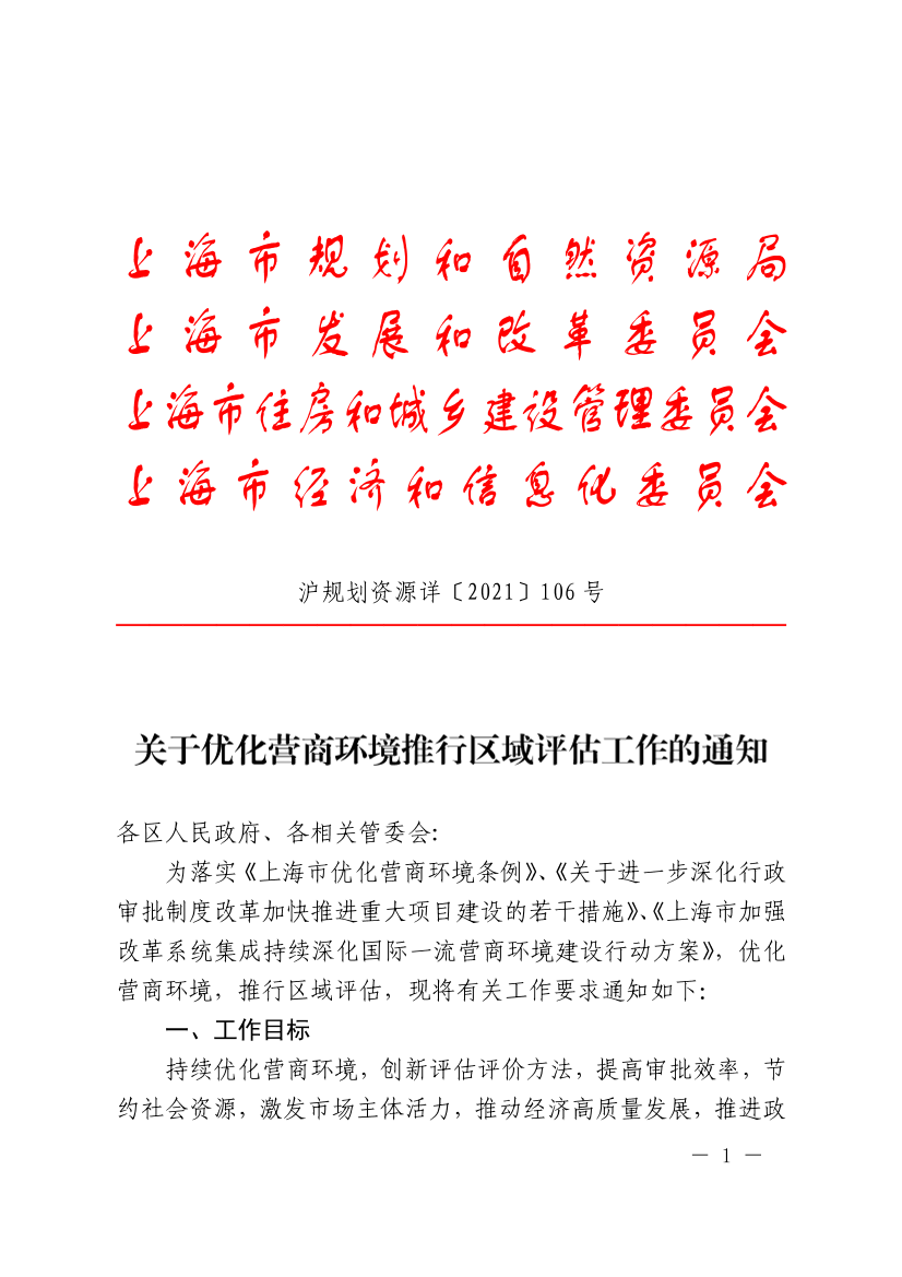 为落实《上海市优化营商环境条例》、《关于进一步深化行政审批制度改革加快推进重大项目建设的若干措施》、《上海市加强改革系统集成持续深化国际一流营商环境建设行动方案》,优化营商环境,推行区域评估,现将有关工作要求通知如下: