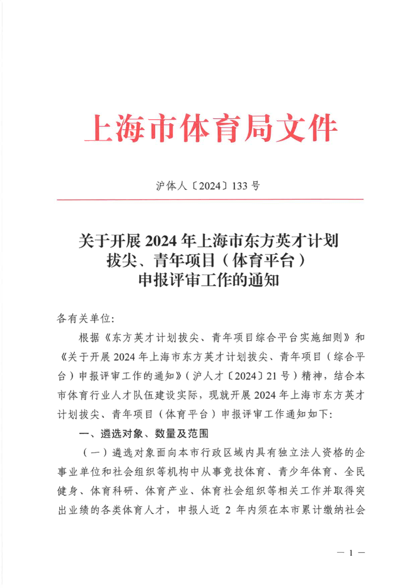 根据《东方英才计划拔尖、青年项目综合平台实施细则》和《关于开展2024年上海市东方英才计划拔尖、青年项目(综合平台)申报评审工作的通知》(沪人才〔2024〕21号)精神,结合本市体育行业人才队伍建设实际,现就开展2024年上海市东方英才计划拔尖、青年项目(体育平台)申报评审工作通知如下: