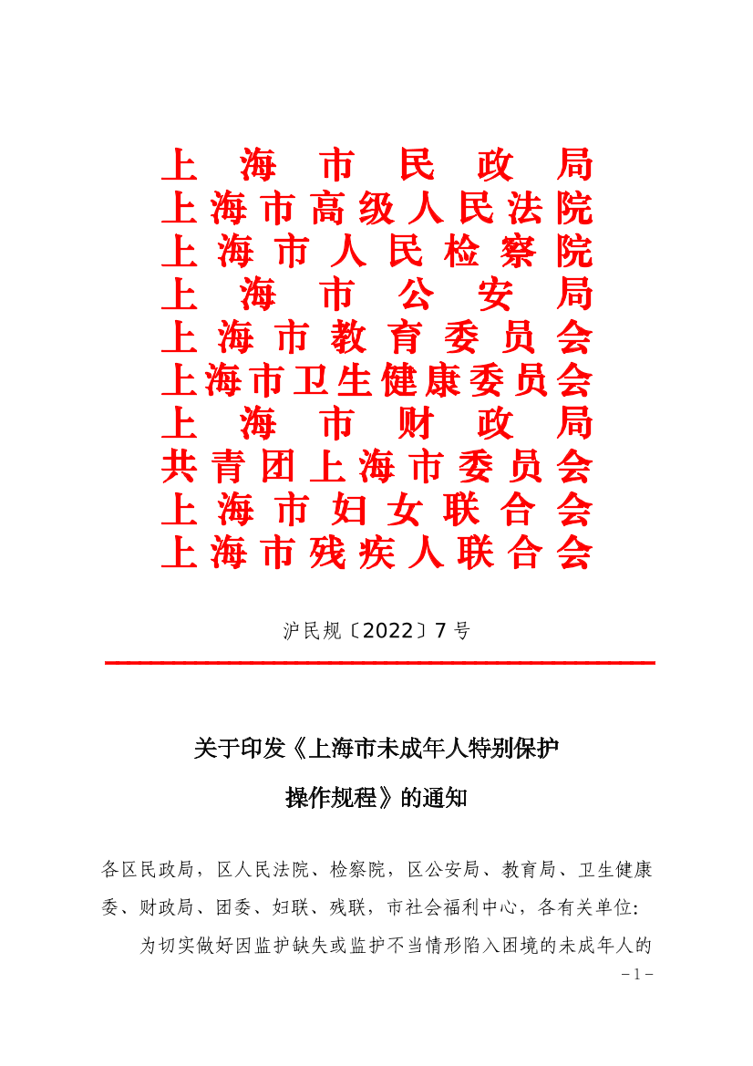 为切实做好因监护缺失或监护不当情形陷入困境的未成年人的特别保护工作,根据《上海市未成年人保护条例》和《上海市人民政府关于深化推进本市困境儿童保障工作的实施意见》(沪府规〔2022〕4号)等相关规定,市民政局、市高院、市检察院、市公安局、市教委、市卫生健康委、市财政局、团市委、市妇联、市残联联合制定了《上海市未成年人特别保护操作规程》。现印发给你们,请遵照执行。