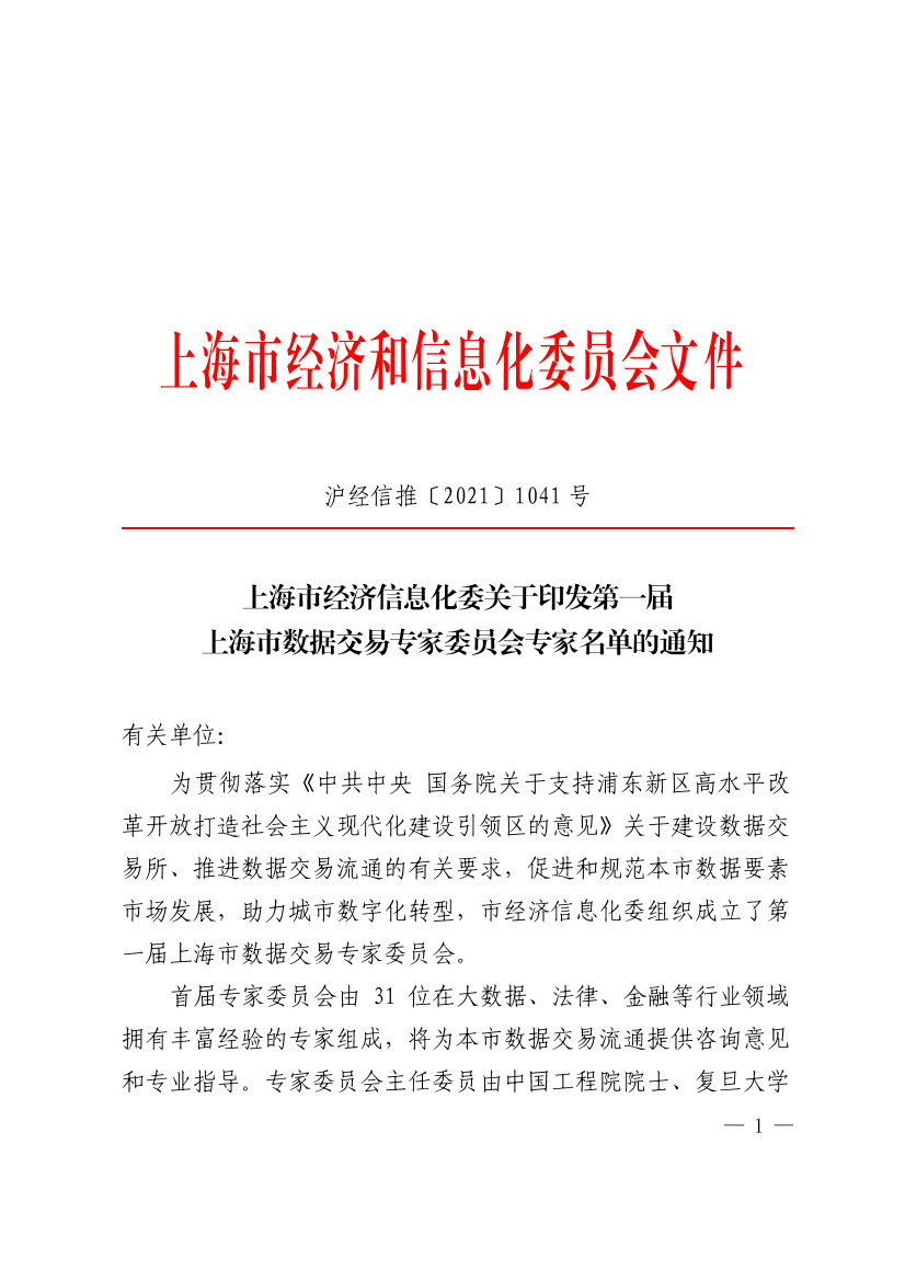 现将《第一届上海市数据交易专家委员会专家名单》印发你们,请结合本单位数据交易流通实践工作,向专家委员会提出指导、咨询需求。
