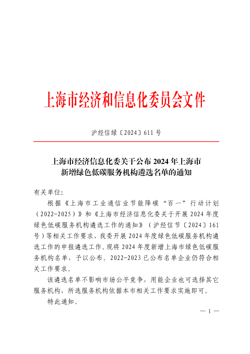 根据《上海市工业通信业节能降碳“百一”行动计划(2022-2025)》和《上海市经济信息化委关于开展2024年度绿色低碳服务机构遴选工作的通知》(沪经信节〔2024〕161号)等相关工作要求,我委开展2024年度绿色低碳服务机构遴选工作的申报遴选工作。现将2024年度新增上海市绿色低碳服务机构名单,予以公布。2022-2023已公布名单企业仍符合相关工作要求。