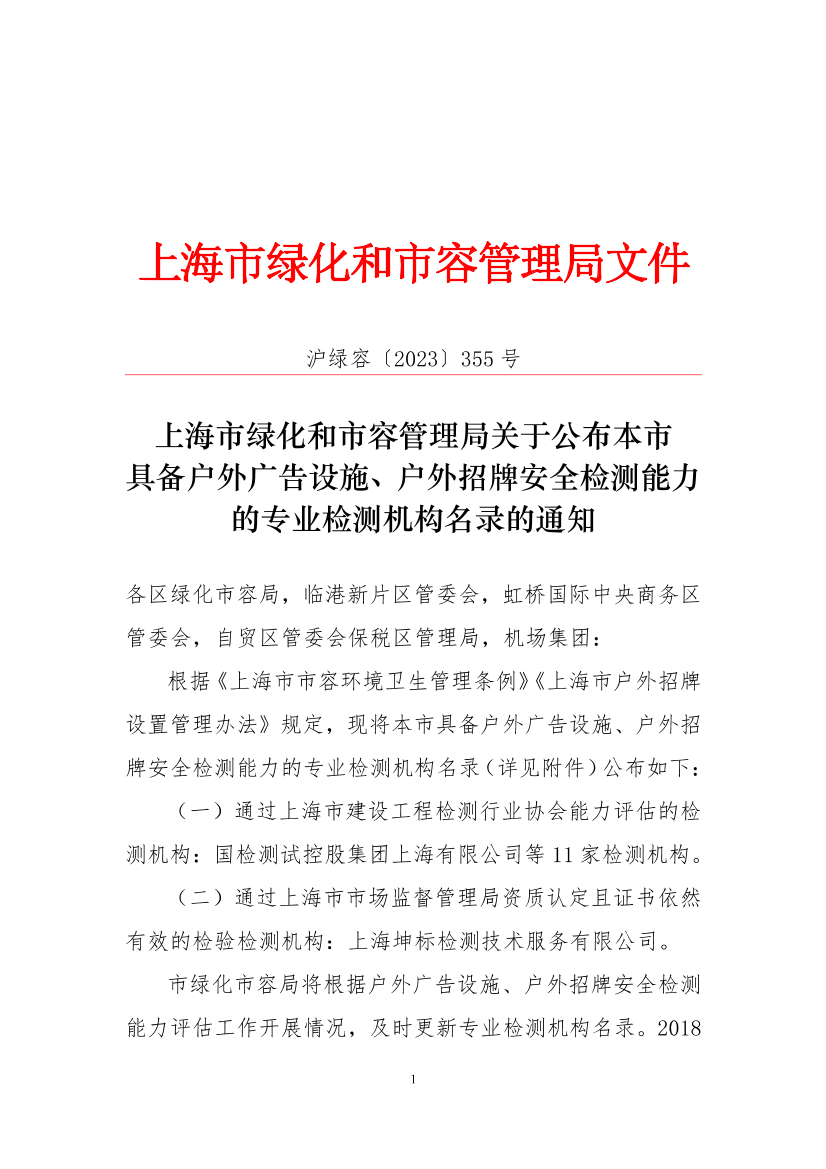 根据《上海市市容环境卫生管理条例》《上海市户外招牌设置管理办法》规定,现将本市具备户外广告设施、户外招牌安全检测能力的专业检测机构名录(详见附件)公布如下: