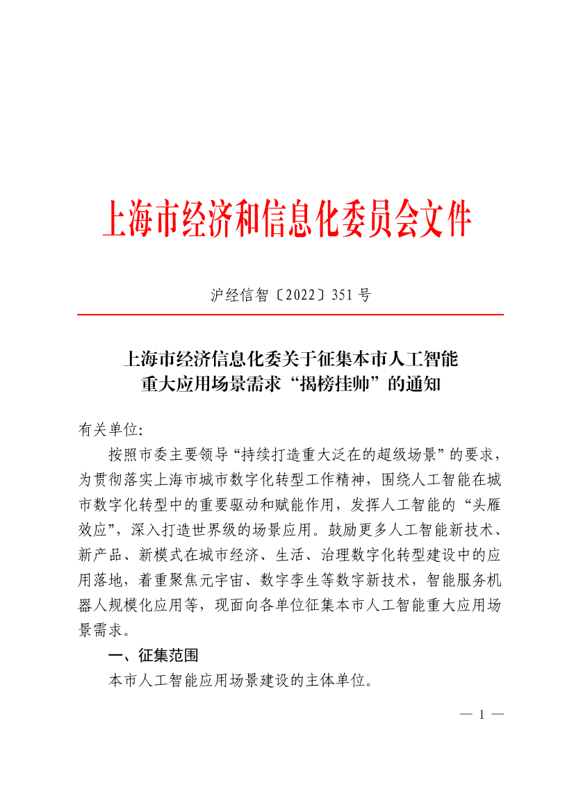 请各单位根据应用场景需求征集重点领域,填写《上海市人工智能重大应用场景需求征集表》(见附件),并于2022年8月5 日下午16:00前,将附件发送至niwj1@sheitc.sh.gov.cn。