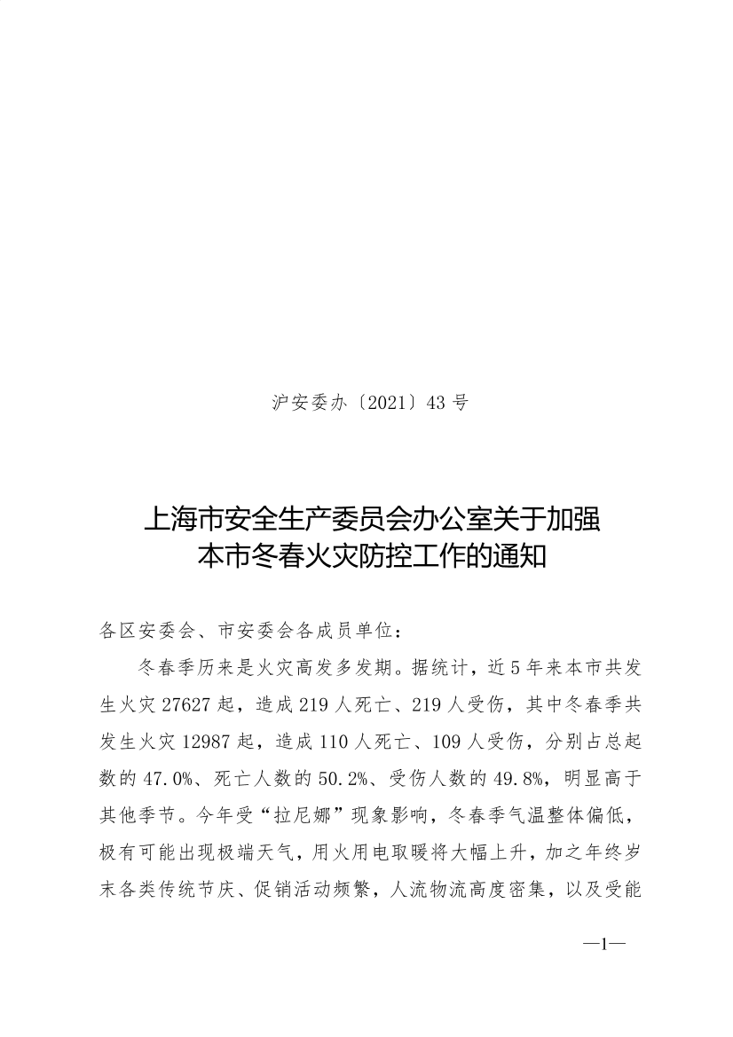 冬春季历来是火灾高发多发期。据统计,近5年来本市共发生火灾27627起,造成219人死亡、219人受伤,其中冬春季共发生火灾12987起,造成110人死亡、109人受伤,分别占总起数的47.0%、死亡人数的50.2%、受伤人数的49.8%,明显高于其他季节。今年受“拉尼娜”现象影响,冬春季气温整体偏低,极有可能出现极端天气,用火用电取暖将大幅上升,加之年终岁末各类传统节庆、促销活动频繁,人流物流高度密集,以及受能源价格上涨对经济活动的影响,各类消防安全风险与疫情防控风险交织叠加,总体形势不容乐观。为有效防范和坚决遏制重特大火灾事故发生,确保冬春期间全市火灾形势稳定,根据《国务院安委会办公室关于加强冬春火灾防控工作的通知》(安委办〔2021〕8号)要求,决定从2021年11月至2022年3月底,集中组织开展冬春火灾防控工作。现就有关事项通知如下。