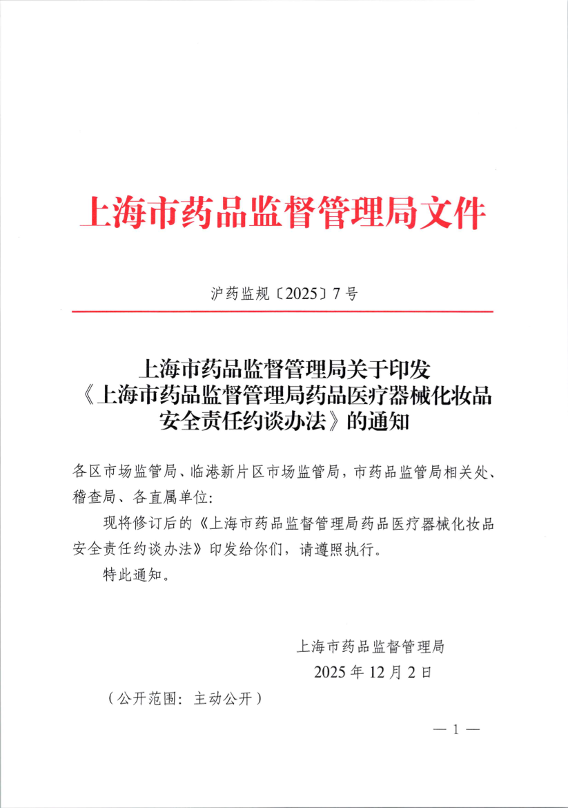上海市药品监督管理局药品医疗器械化妆品安全责任约谈办法