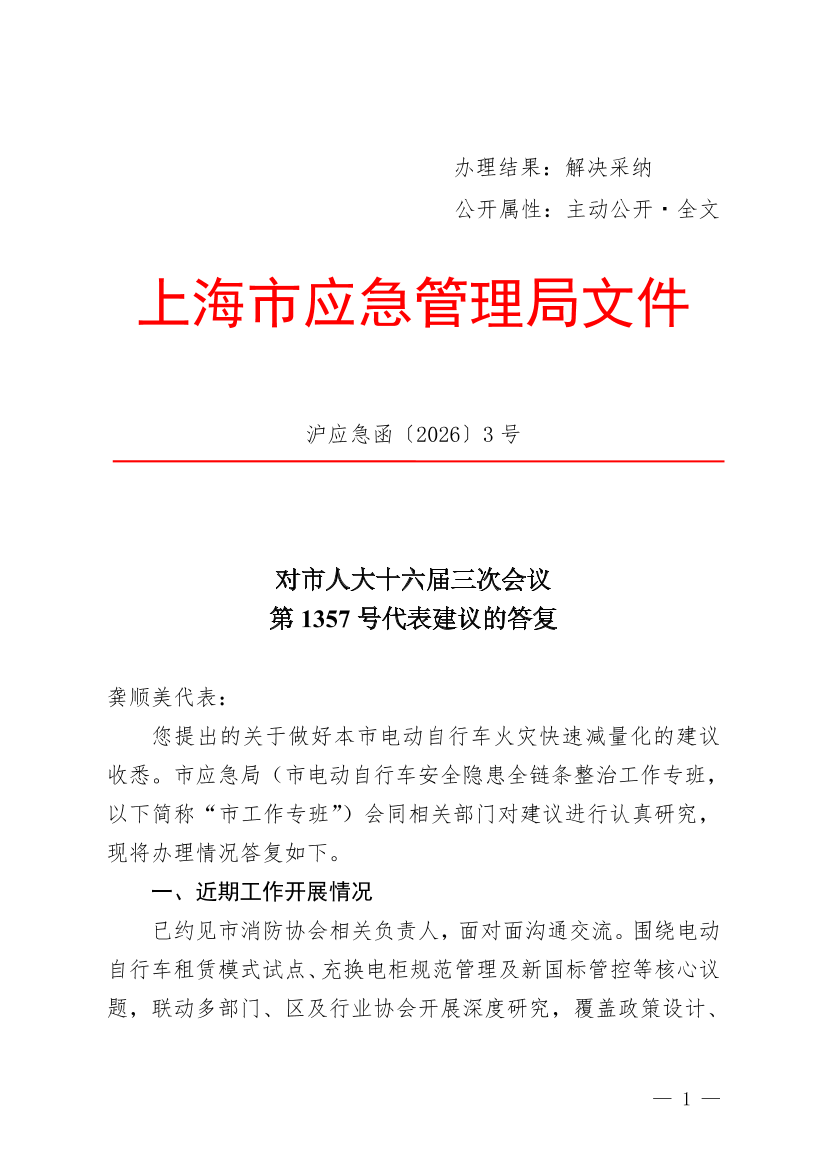 您提出的关于做好本市电动自行车火灾快速减量化的建议收悉。市应急局(市电动自行车安全隐患全链条整治工作专班,以下简称“市工作专班”)会同相关部门对建议进行认真研究,现将办理情况答复如下。
