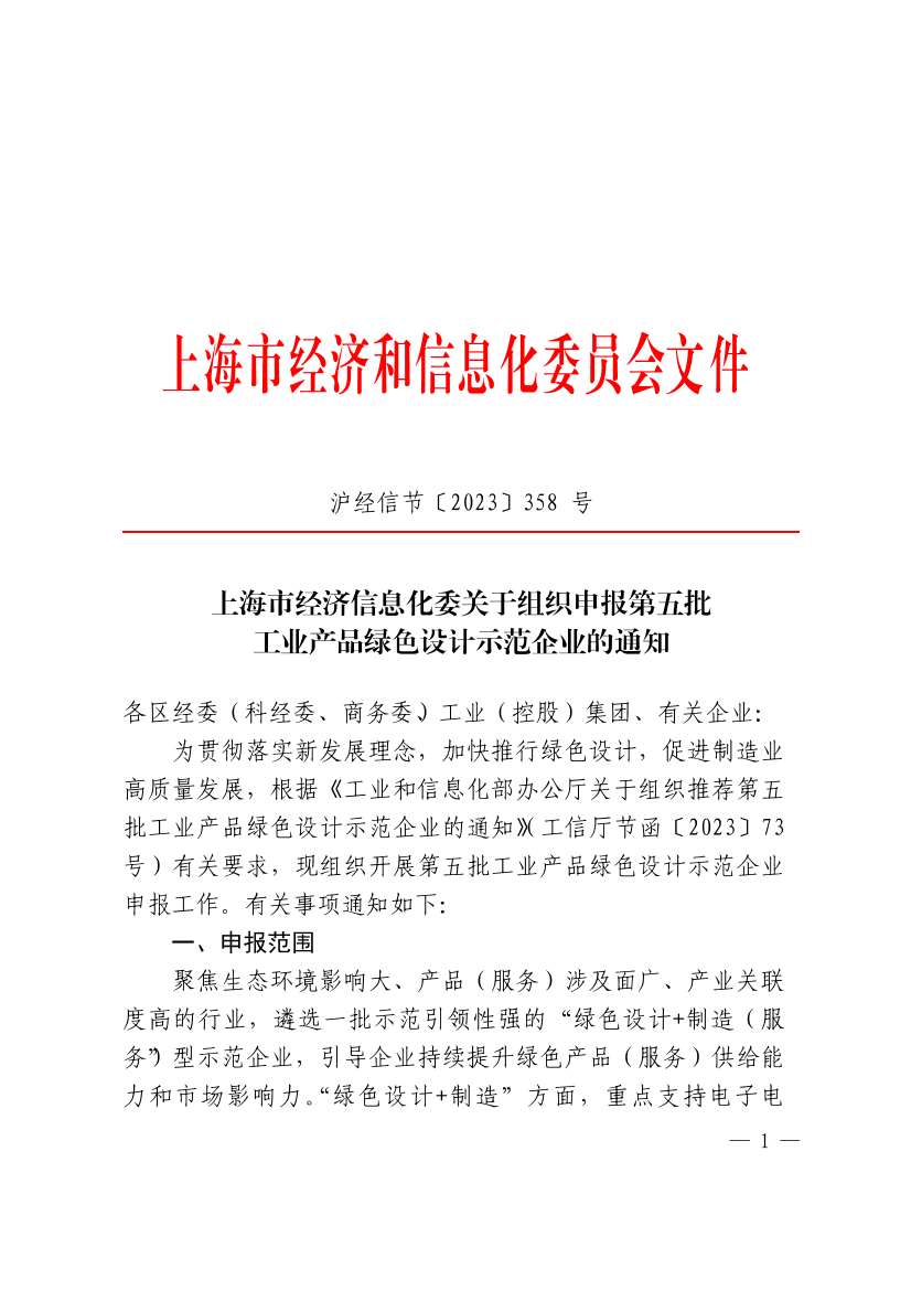 为贯彻落实新发展理念,加快推行绿色设计,促进制造业高质量发展,根据《工业和信息化部办公厅关于组织推荐第五批工业产品绿色设计示范企业的通知》(工信厅节函〔2023〕73号)有关要求,现组织开展第五批工业产品绿色设计示范企业申报工作。有关事项通知如下: