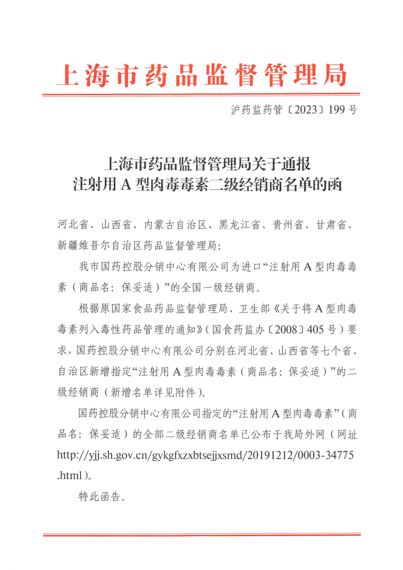 国药控股分销中心有限公司指定的“注射用A型肉毒毒素”(商品名:保妥适)的全部二级经销商名单已公布于我局外网(网址http://yjj.sh.gov.cn/gykgfxzxbtsejjxsmd/20191212/0003-34775.html)。