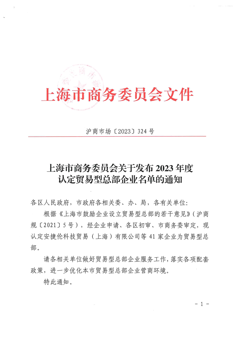 根据《上海市鼓励企业设立贸易型总部的若干意见》(沪商规〔2021〕5号),经企业申请、各区初审、市商务委审定,现认定安捷伦科技贸易(上海)有限公司等41家企业为贸易型总部。