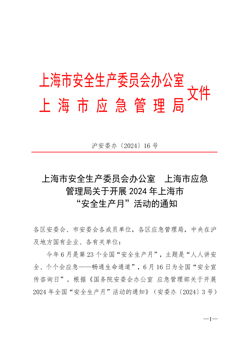 今年6月是第23个全国“安全生产月”,主题是“人人讲安全、个个会应急——畅通生命通道”,6月16日为全国“安全宣传咨询日”。根据《国务院安委会办公室 应急管理部关于开展2024年全国“安全生产月”活动的通知》(安委办〔2024〕3号)精神,结合上海工作实际,今年6月本市将与全国同步开展2024年上海市“安全生产月”活动。现就有关事项通知如下。