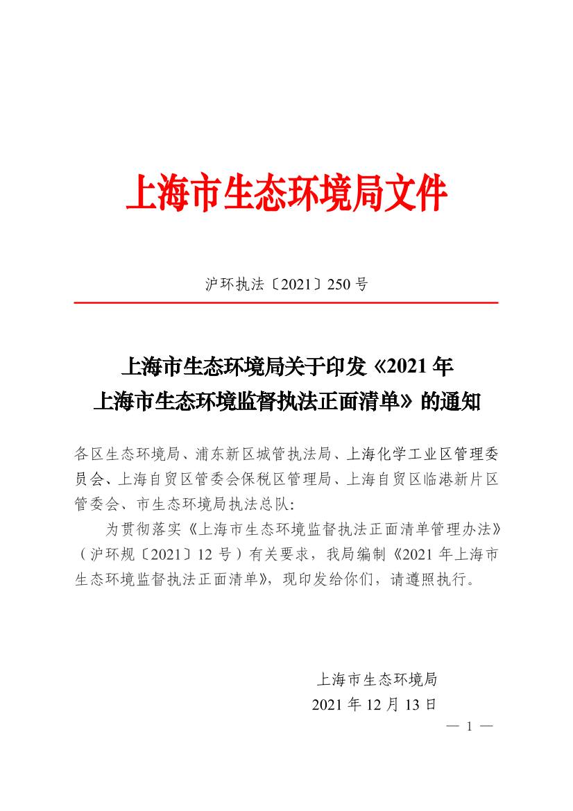 为贯彻落实《上海市生态环境监督执法正面清单管理办法》(沪环规〔2021〕12号)有关要求,我局编制《2021年上海市生态环境监督执法正面清单》,现印发给你们,请遵照执行。