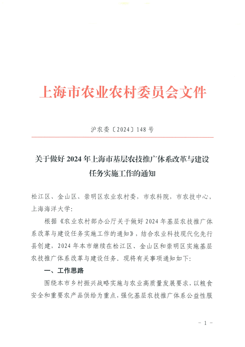 根据《农业农村部办公厅关于做好2024年基层农技推广体系改革与建设任务实施工作的通知》,结合农业科技现代化先行县创建,2024年本市继续在松江区、金山区和崇明区实施基层农技推广体系改革与建设任务。现将有关事项通知如下: