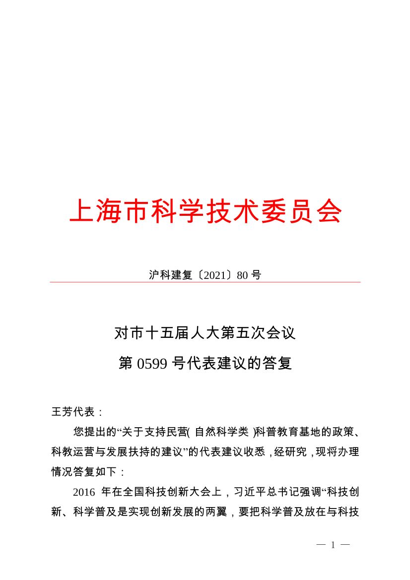 您提出的“关于支持民营(自然科学类)科普教育基地的政策、科教运营与发展扶持的建议”的代表建议收悉,经研究,现将办理情况答复如下: