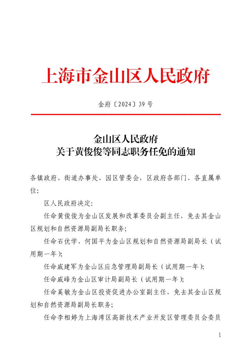 任命黄俊俊为金山区发展和改革委员会副主任,免去其金山区规划和自然资源局副局长职务;