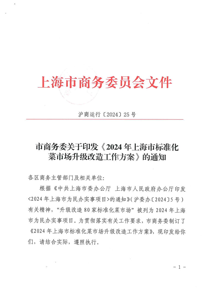 1.市商务委印发《2024年上海市标准化菜市场升级改造工作方案》(以下简称《工作方案》),明确2024年各区标准化菜市场升级改造任务及建设要求,召开全市动员部署会,启动实事项目建设。