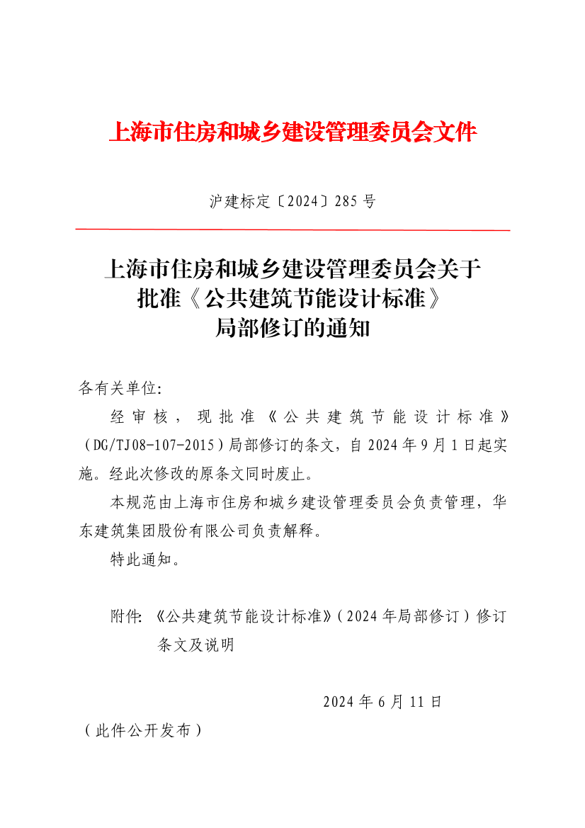 经审核,现批准《公共建筑节能设计标准》(DG/TJ08-107-2015)局部修订的条文,自2024年9月1日起实施。经此次修改的原条文同时废止。
