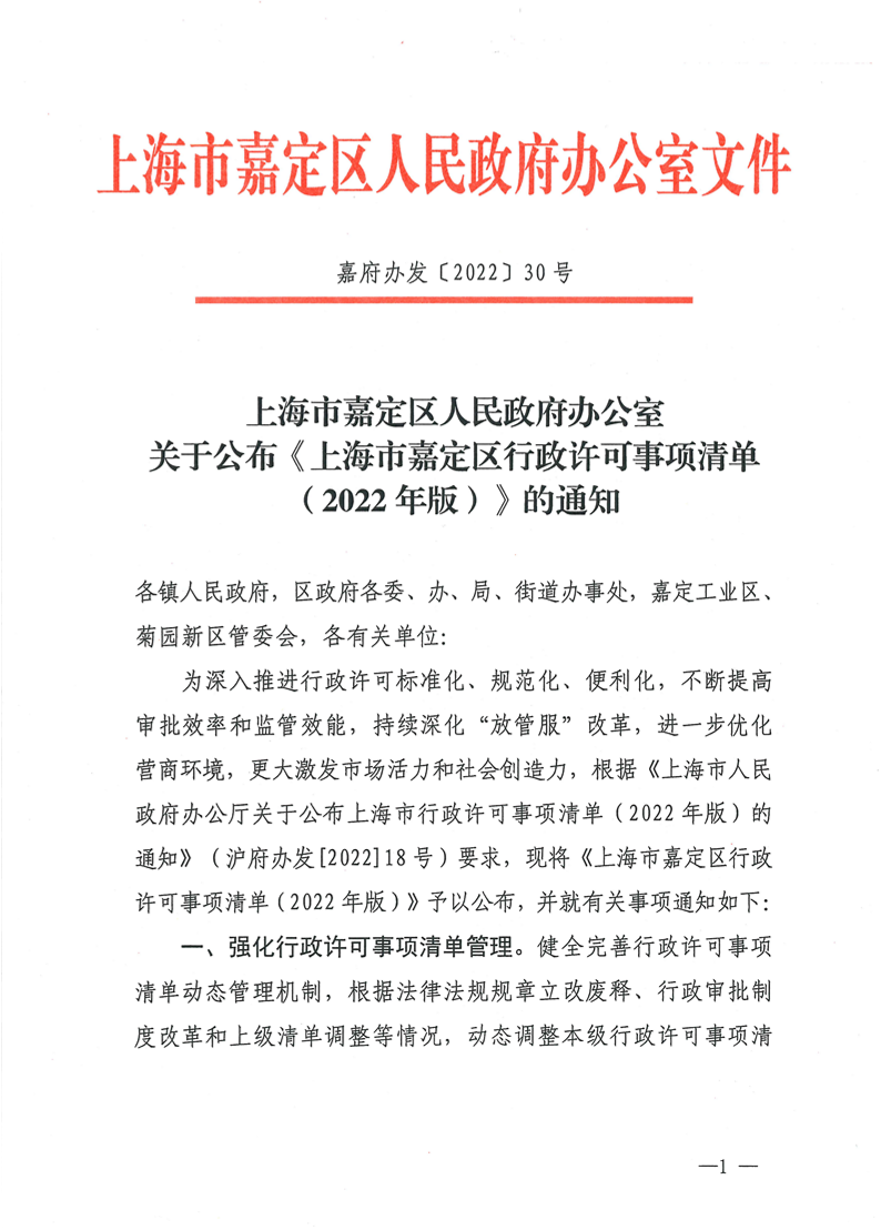 为深入推进行政许可标准化、规范化、便利化,不断提高审批效率和监管效能,持续深化“放管服”改革,进一步优化营商环境,更大激发市场活力和社会创造力,根据《上海市人民政府办公厅关于公布上海市行政许可事项清单(2022年版)的通知》(沪府办发[2022]18号)要求,现将《上海市嘉定区行政许可事项清单(2022年版)》予以公布,并就有关事项通知如下: