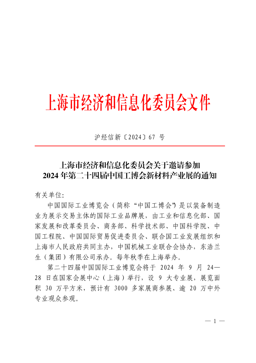 为此,我们诚邀有关中外企事业单位、行业协会和行业主管部门参加2024第二十四届中国工博会新材料产业展,协助我们共同做好相关筹备工作。具体事宜可联系上海市经济和信息化委员会新材料处或上海工业商务展览有限公司。