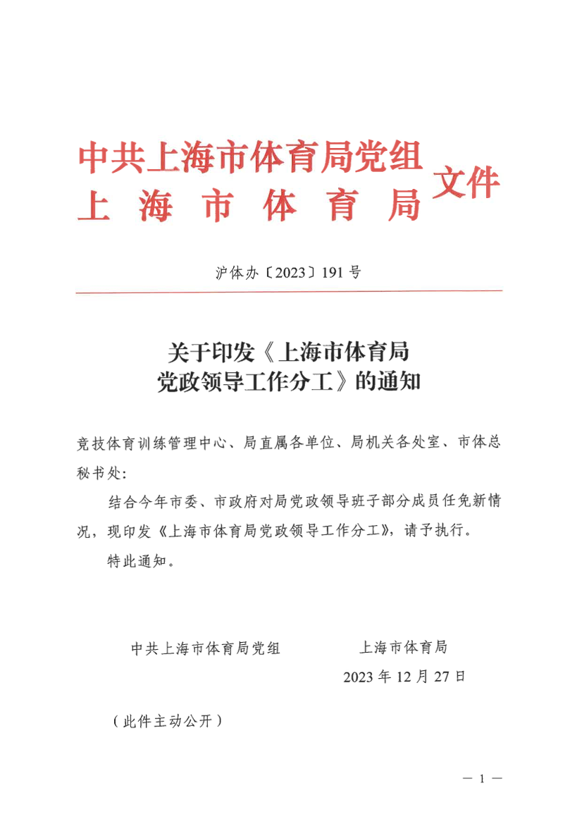 结合今年市委、市政府对局党政领导班子部分成员任免新情况,现印发《上海市体育局党政领导工作分工》,请予执行。