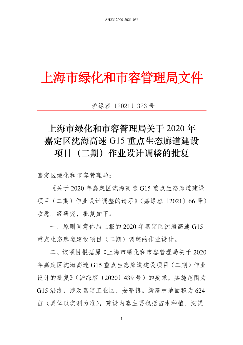 《关于2020年嘉定区沈海高速G15重点生态廊道建设项目(二期)作业设计调整的请示》(嘉绿容〔2021〕66号)收悉。经研究,批复如下: