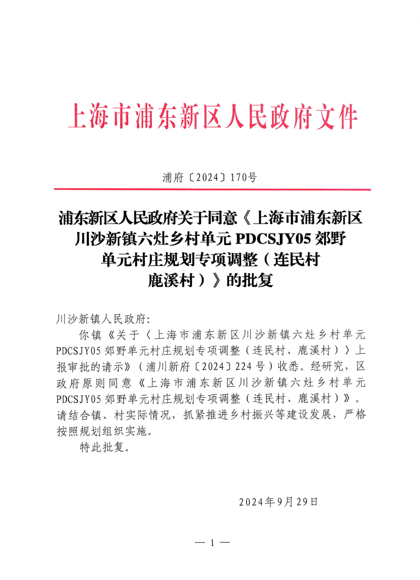 你镇《关于〈上海市浦东新区川沙新镇六灶乡村单元PDCSJY05郊野单元村庄规划专项调整(连民村、鹿溪村)〉上报审批的请示》(浦川新府〔2024〕224号)收悉。经研究,区政府原则同意《上海市浦东新区川沙新镇六灶乡村单元PDCSJY05郊野单元村庄规划专项调整(连民村、鹿溪村)》。请结合镇、村实际情况,抓紧推进乡村振兴等建设发展,严格按照规划组织实施。