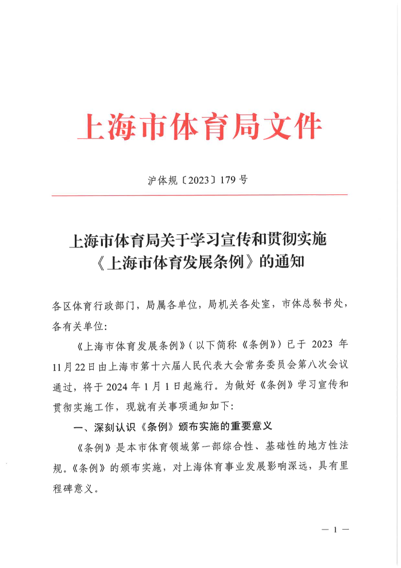 《上海市体育发展条例》(以下简称《条例》)已于2023年11月22日由上海市第十六届人民代表大会常务委员会第八次会议通过,将于2024年1月1日起施行。为做好《条例》学习宣传和贯彻实施工作,现就有关事项通知如下: