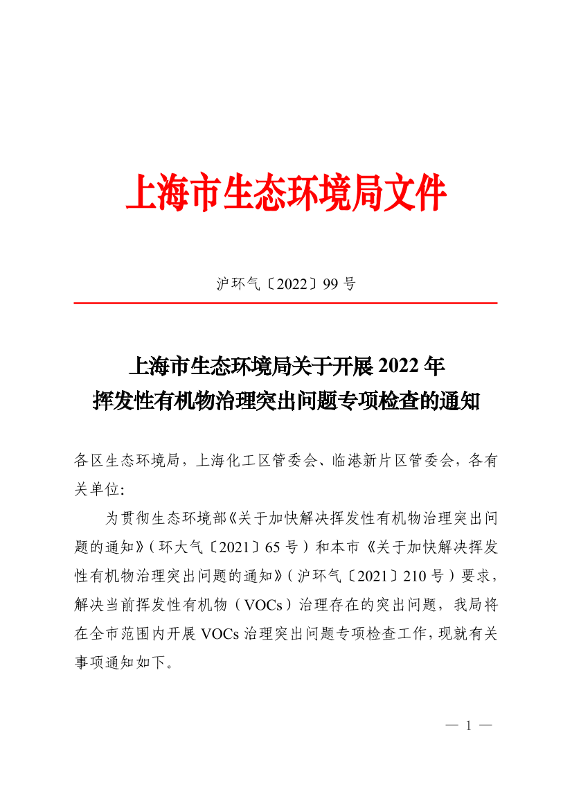 为贯彻生态环境部《关于加快解决挥发性有机物治理突出问题的通知》(环大气〔2021〕65号)和本市《关于加快解决挥发性有机物治理突出问题的通知》(沪环气〔2021〕210号)要求,解决当前挥发性有机物(VOCs)治理存在的突出问题,我局将在全市范围内开展VOCs治理突出问题专项检查工作,现就有关事项通知如下。