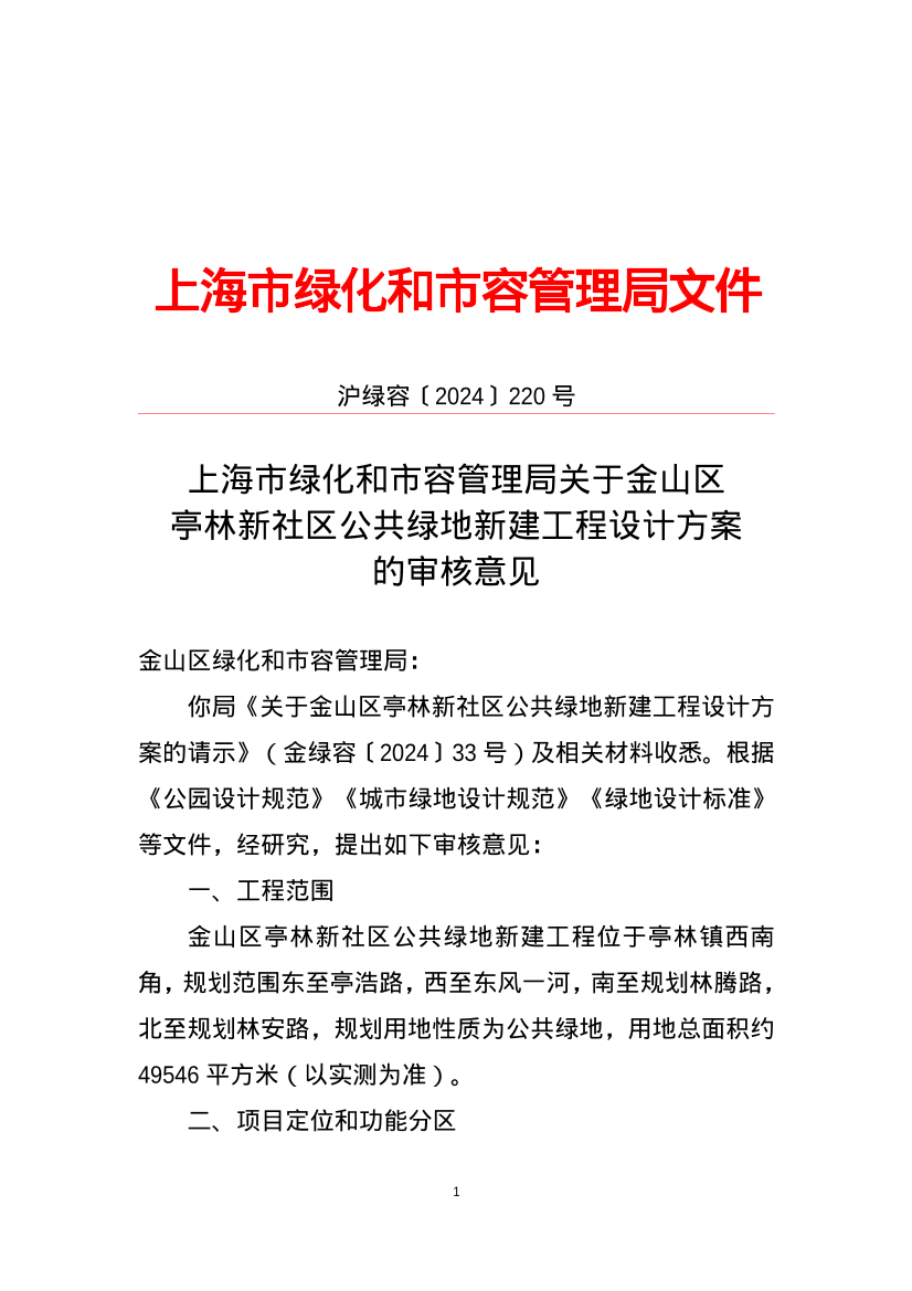 你局《关于金山区亭林新社区公共绿地新建工程设计方案的请示》(金绿容〔2024〕33号)及相关材料收悉。根据《公园设计规范》《城市绿地设计规范》《绿地设计标准》