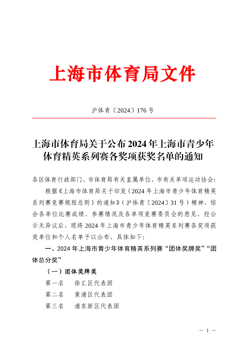 一、2024年上海市青少年体育精英系列赛“团体奖牌奖”“团体总分奖”