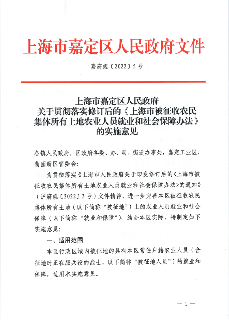 为贯彻落实《上海市人民政府关于印发修订后的<上海市被征收农民集体所有土地农业人员就业和社会保障办法>的通知》(沪府规〔2022〕3号)文件精神,进一步完善本区被征收农民集体所有土地(以下简称“被征地”)上的农业人员就业和社会保障(以下简称“就业和保障”),结合本区实际,特制定如下实施意见: