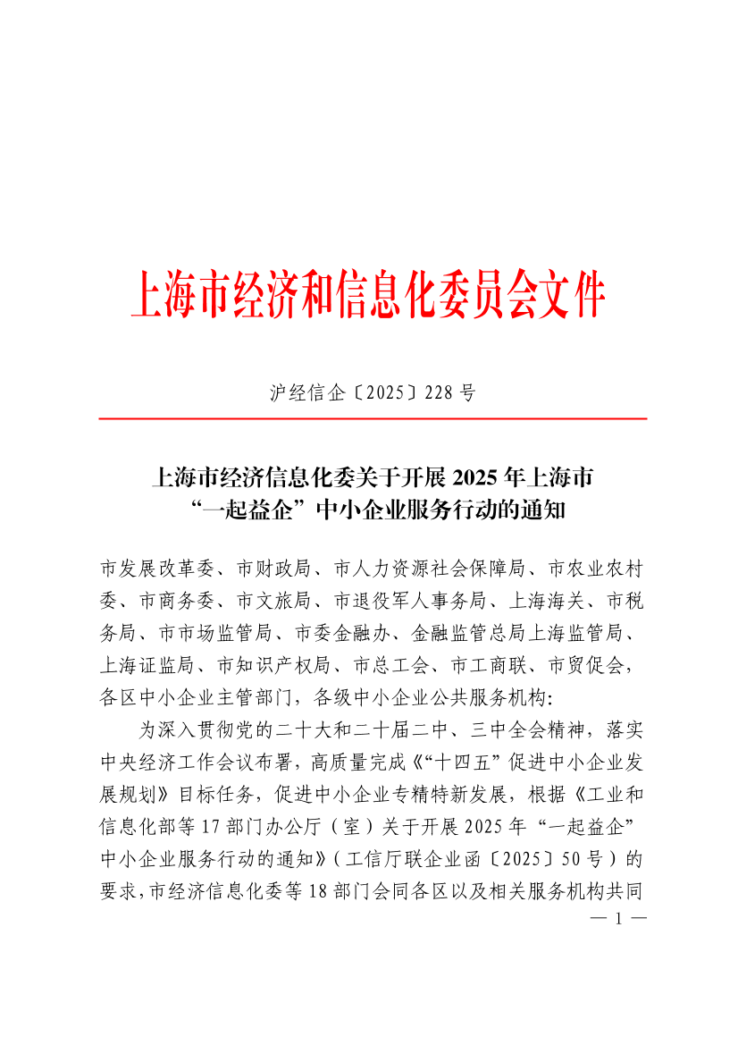 为深入贯彻党的二十大和二十届二中、三中全会精神,落实中央经济工作会议布署,高质量完成《“十四五”促进中小企业发展规划》目标任务,促进中小企业专精特新发展,根据《工业和信息化部等17部门办公厅(室)关于开展2025年“一起益企”中小企业服务行动的通知》(工信厅联企业函〔2025〕50号)的要求,市经济信息化委等18部门会同各区以及相关服务机构共同组织开展2025年上海市“一起益企”中小企业服务行动。有关事项通知如下: