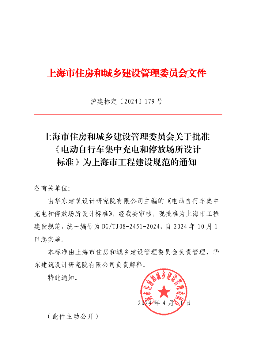 由华东建筑设计研究院有限公司主编的《电动自行车集中充电和停放场所设计标准》,经我委审核,现批准为上海市工程建设规范,统一编号为DG/TJ08-2451-2024,自2024年10月1日起实施。