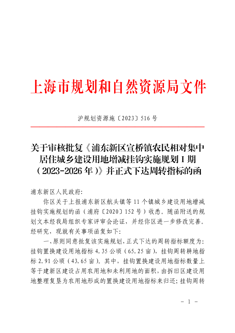 关于审核批复《浦东新区宣桥镇农民相对集中居住城乡建设用地增减挂钩实施规划Ⅰ期(2023-2026年)》并正式下达周转指标的函